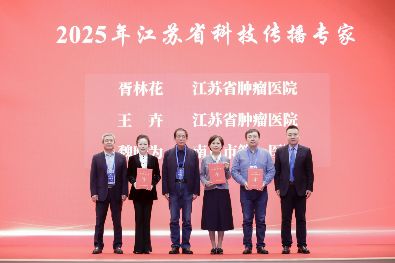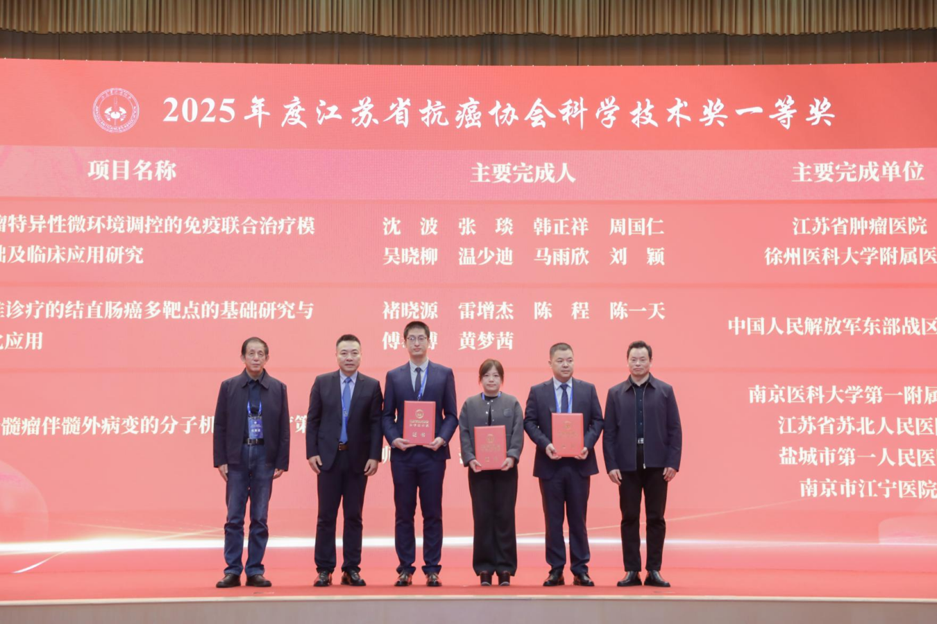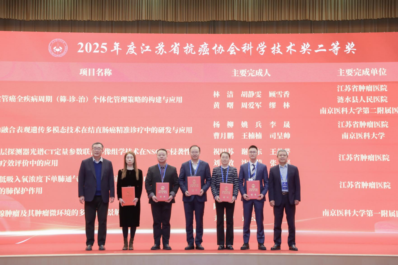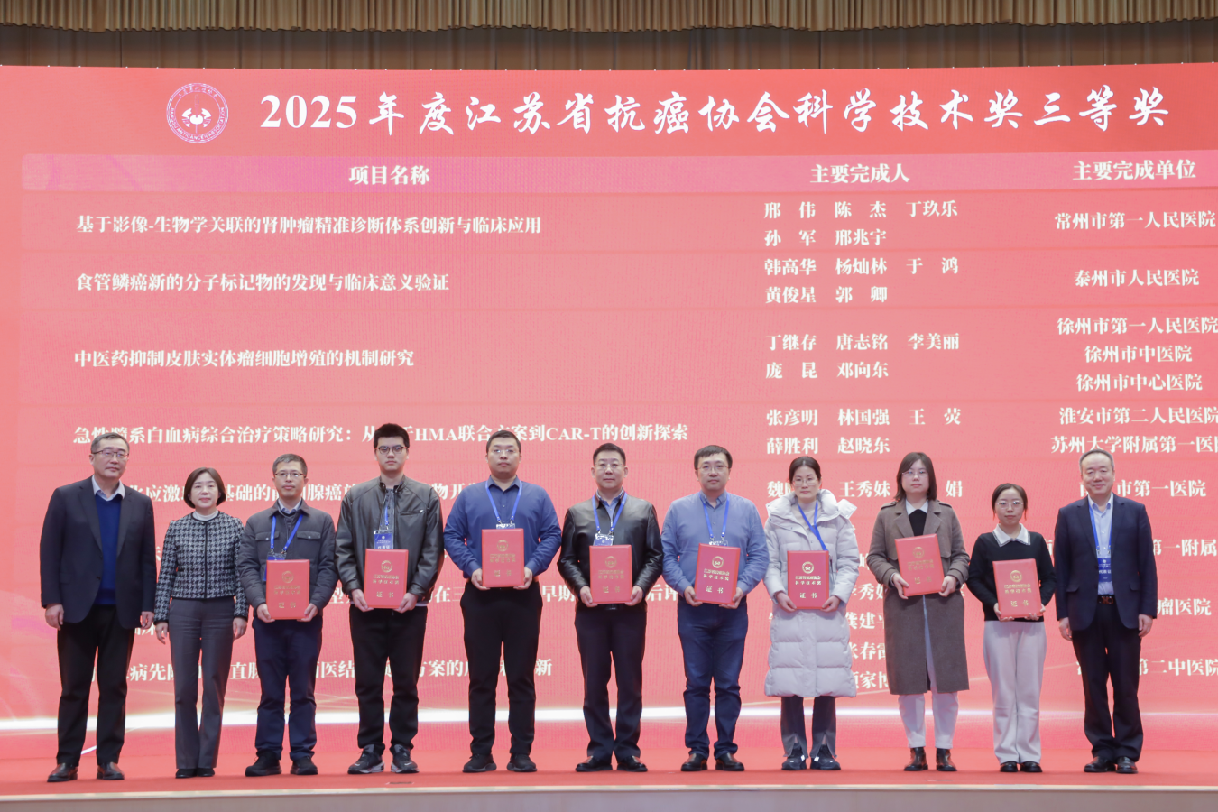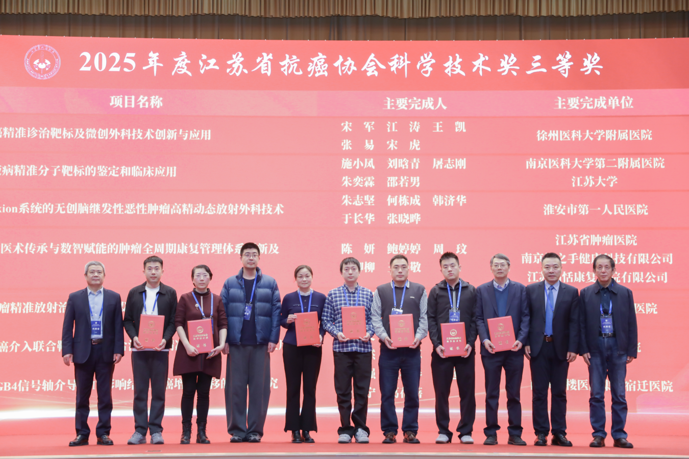 会议最后举行了颁奖仪式。大会向2025年江苏省科技传播专家入选者、2025年江苏省自然科学百篇优秀学术论文获得者、2025年江苏省青年科技人才托举工程入选者以及2025年度江苏省抗癌协会科学技术奖获奖项目代表颁发了证书。